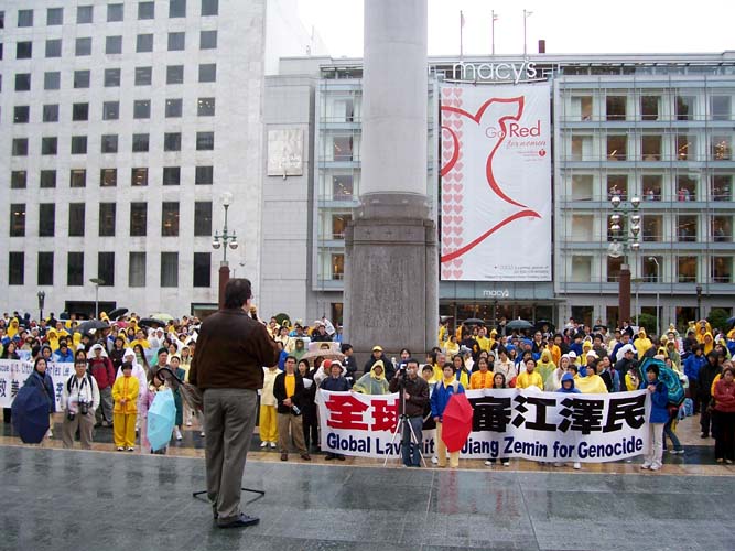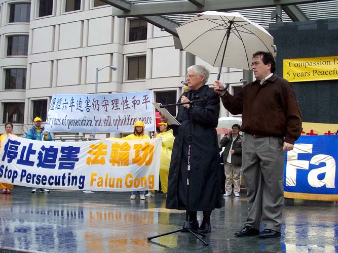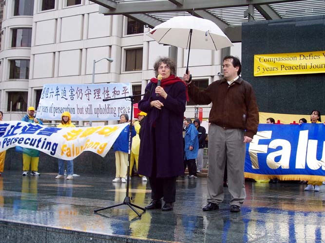 加州国会议员汤姆-兰托斯特地为集会发来信函支持,并派代表玛格丽-法莱女士宣读。兰托斯在致词说,我今天非常高兴和你们一起教育旧金山湾区的社区民众,法轮功学员在面对中共政权五年的迫害中所表现出的和平理性。我赞赏法轮功学员和支持者们长期秉持的和平与慈悲。