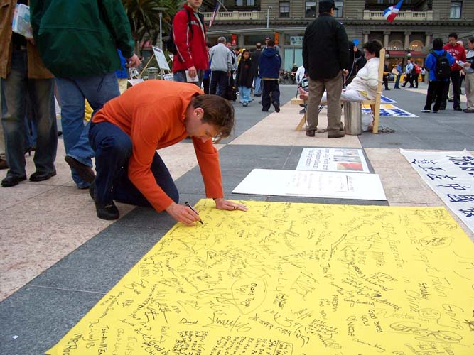 ![]() 呼吁营救弟弟的黄万青博士 | ![]() 民众在呼吁停止迫害的黄布上签名 | ![]() 观看真善忍画展 |