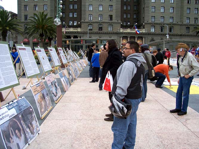 在集会现场还举办了酷刑展和真善忍画展,一位在呼吁停止迫害的黄布上签名的男士说,我非常高兴你们能把这些告诉人们,因为很多发生在中国的消息都被封锁了,外界不知道在中国到底发生了什么。我今天是第一次了解到在中国发生的迫害,迫害不应该发生。