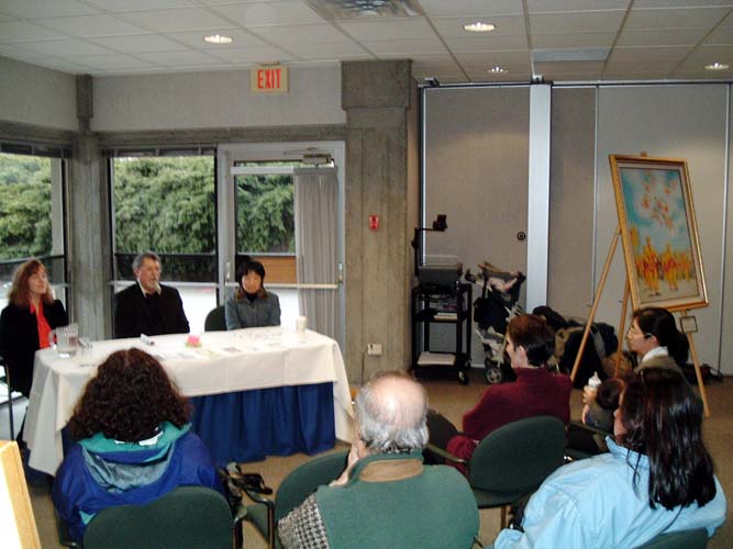 听了天啸家庭的悲剧后,一些参观者流下了眼泪。画展中,有西人学员去北京呼吁及受迫害的油画。布朗文曾去过北京为法轮功和平呼吁,对迫害有亲身的体会。画展中还有表现学员被强迫灌食的油画,学员黄丽敏告诉参观者自己的弟弟就是因为坚持不放弃修炼、去信访办上访被非法关押4年,在劳教所被多次野蛮灌食。她们都是这场迫害的直接和间接的见证人。