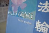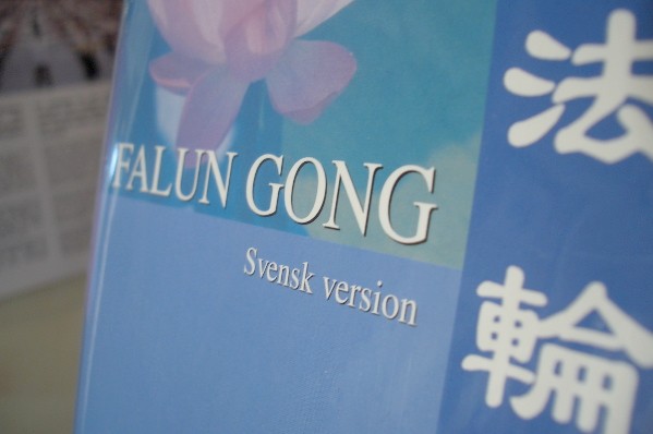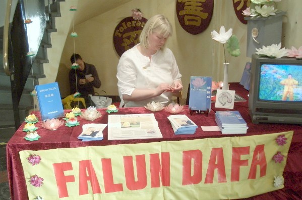 法轮功学员们带来的纸莲花,将分送给参观者;另外,他们还带来了以布制作的莲花以及罩子装饰展位。在墙壁上,学员们放了三个展板,上面有“真善忍”的字样。瑞典文译本的《法轮功》新版书籍也摆放在展位上。