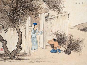 曾参,字子舆,春秋时期鲁国人,孔子的得意弟子,世称“曾子”,以孝著称。少年时家贫,常入山打柴。一天,家里来了客人,母亲不知所措,就用牙咬自己的手指。曾参忽然觉得心疼,知道母亲在呼唤自己,便背着柴迅速返回家中,跪问缘故。母亲说:“有客人忽然到来,我咬手指盼你回来。”曾参于是接见客人,以礼相待。