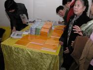 在法轮功学员展位前驻足观看、咨询者异常踊跃