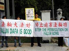 【明慧网2005年3月15日】2005年3月11日和12日,马来西亚法轮功学员一连两天在中国驻马大使馆前和平请愿,呼吁停止在中国对法轮功学员的残酷迫害。学员于上班巅峰时间站在车水马龙的大马路旁发正念,并且拉开“法轮大法好”、“停止迫害法轮功”等横幅,展示受迫害法轮功学员的图片。路过的车辆经过时都放慢速度观看、阅读横幅上的文字。在场的警员也纷纷向学员索取真象资料,了解迫害事实。