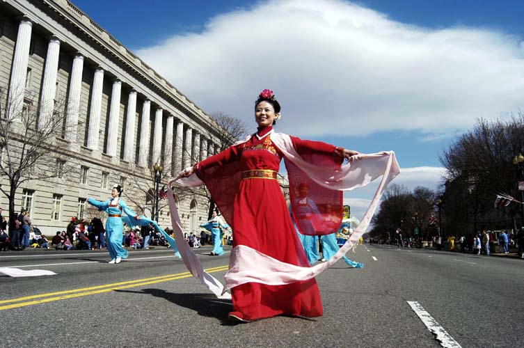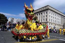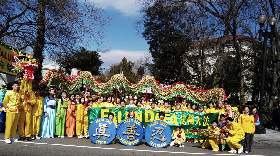学员们特地为此次游行赶制的绿色(圣派翠克日的传统颜色)的印有中英文法轮大法字样的横幅走在法轮功队伍的最前面。在精心布置的花车上,各族裔的法轮功学员和小弟子们向观众们演炼着优美的功法,引来观众的阵阵掌声。法轮功学员的仙女队和舞龙队也为整个游行增色不少。当经过主席台时,游行主持人透过扩音器向观众们介绍法轮大法在世界的洪传并感谢法轮功学员的参加。