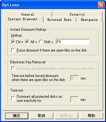 安装StrongDisk后重启。设置热键,主菜单中options—general之open window Hotkey打开主窗口,instant dismount中的热键关闭所有已打开的加密文件。用Mount打开加密文件,用create创建加密文件。加密文件的格式是一个虚拟的磁盘,一般选用FAT32格式,floating size比较好,能自动按内容大小增长文件大小,空间可选大些(600MB),最大4G。加密算法用默认选项就好。关闭文件前需要先关闭资源管理器。密码可用一个字串,也可用一整个文件。