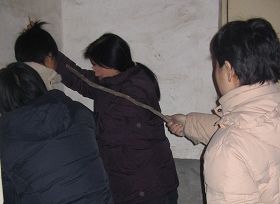 【明慧网2005年3月15日】以下记录了河北省高阳劳教所于2002年对大法弟子的部分折磨手段。照片为根据当事人描述而重组的当时迫害的情景。