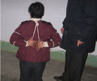 大法学员被铐到铁门的门框上只能脚尖着地,一会儿就会休克。邯郸市大法学员赵美华因炼功,长期被关禁闭,2001年4月一次长达7天之久,被恶警队长强行戴吊铐。她在没有任何办法的情况下绝食抗议,三天后被强行灌食,经过这样反复的折磨,导致她精神失常。