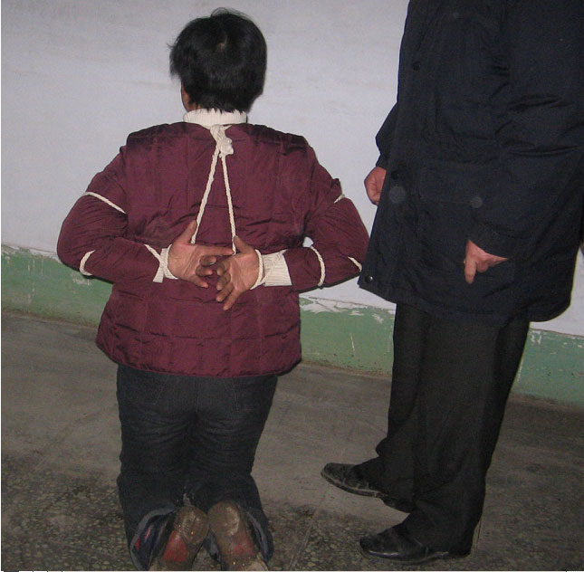 2000年3月初陈建国和耿行军对多名抵制迫害的法轮功学员实施上绳的酷刑。大法学员被叫到队长办公室一脚踹倒,一名恶警抓住学员的头发用力向后推头,两名恶警用力向上拉两条胳膊上的绳子。学员的头发被揪得地上一层,感到颈椎要断了,呼吸困难,心跳加速。到这种程度,恶警还往学员胳膊下一层层塞重物以加重痛苦程度。当学员几乎昏厥时,恶警才解下绳子。这时学员的全身已经麻木的失控成僵死状。等稍缓恶警就再次上绳,有时绳子都被勒断,勒到肉中,恶警一边用刑,旁边还有几个恶警恐吓学员“还炼不炼?”