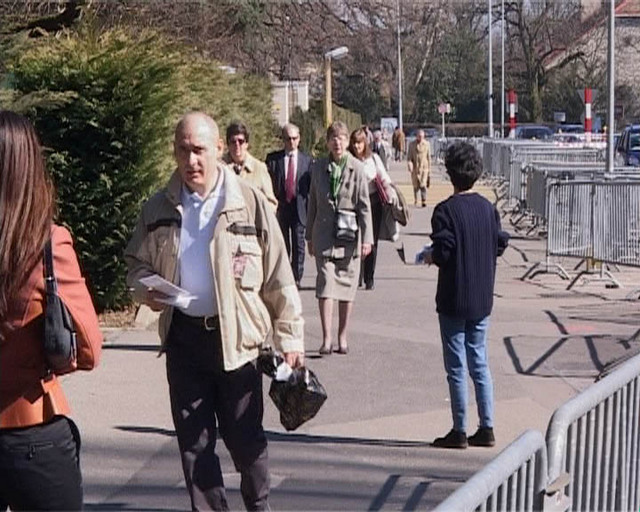 瑞士学员由全国各地纷纷涌向日内瓦,有的拉着道具驱车纵穿瑞士,早早赶到活动地点;有的带着还在吃奶的孩子也匆匆赶来。大家积极主动,配合默契,有的担任反酷刑展的演员,有的在路边向行人散发法轮功真象材料,有的在表演功法……