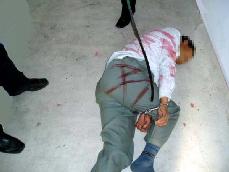 方正县拘留所恶警所长赵小波、胡亚军、全兴同指使刑事犯:杀人犯王义、诈骗强奸犯邓洪鹏、轮奸犯原沙河子农场派出所副所长杨明军、过失杀人犯滕树学等打手,残酷的折磨法轮功学员,酷刑手段包括:1弹眼珠;2扎手指、脚趾、背部、头、脸等全身各处;3打软肋;4用皮鞋跟砍嗓子、砸头;5拔胡子; 6撅着用脚踹等。(如演示图1)