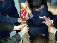 恶警指使犯人狠踩高科等大法弟子的手指,手指被踩得肿痛难忍。