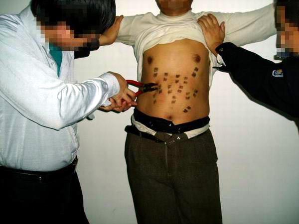 恶警指使犯人用钢钳狠夹法轮功学员的肌肉,法轮功学员身上被夹得一块块的青紫,剧痛难忍。