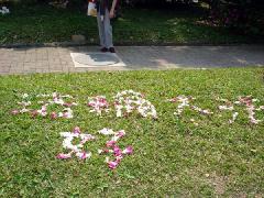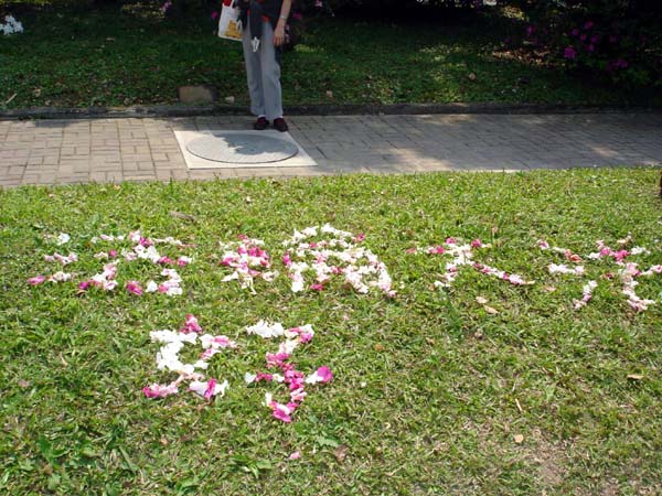 在台湾大学著名的椰林大道上,法轮功研究社的学生们用杜鹃花瓣排成了“法轮大法好”字样。绿色的草坪上,金黄色的阳光洒落在粉嫩色的杜鹃花所排成的字上,相当美丽耀眼,路过的人们都开心的喊着“法轮大法好!”