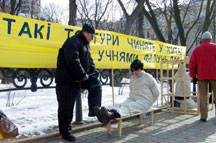 2005年3月22日,乌克兰法轮功学员在中国驻乌克兰大使馆对面举行反酷刑展,希望更多的人了解在中国正在发生的、已持续了将近6年的对法轮功学员的残酷迫害。