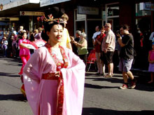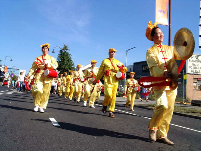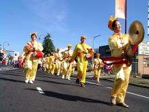 ![]() 喜气洋洋的腰鼓队 | ![]() 法轮功队伍中的仙女 |