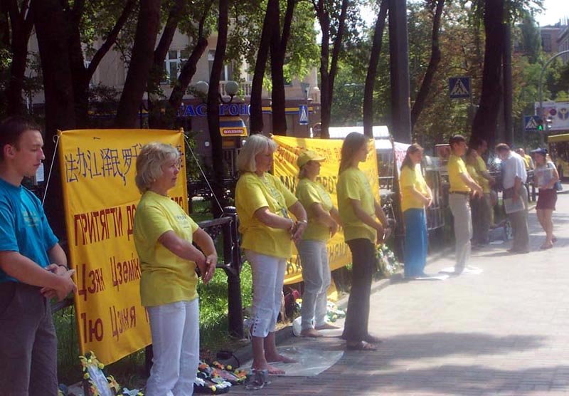 2004年7月20日,乌克兰首都基辅市的法轮功学员们在中国驻乌克兰大使馆前举行了抗议静坐集会。