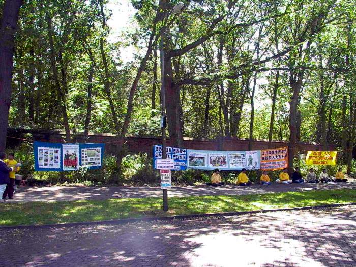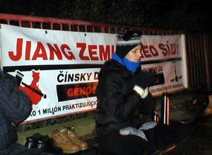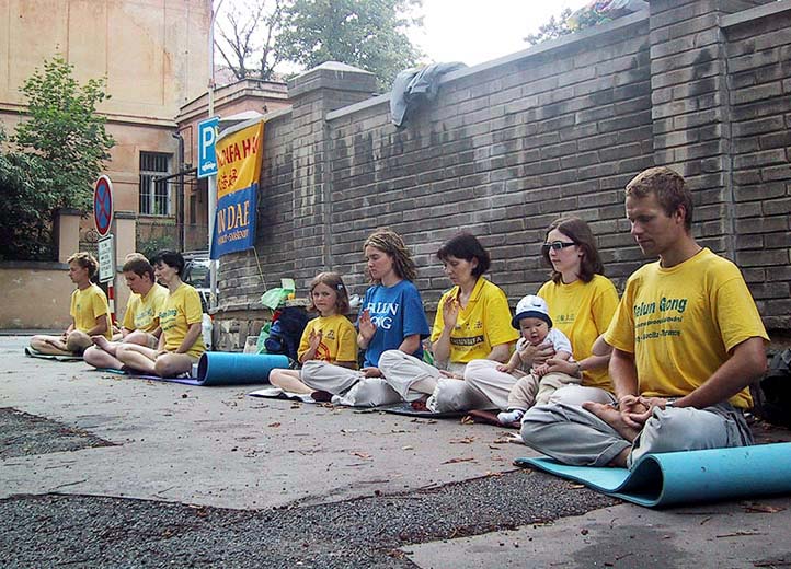 2004年7月20日,江氏集团迫害法轮功五周年之际,捷克的法轮功学员以在驻布拉格中国大使馆前和平打坐炼功36小时的方式,希望人们关注在中国发生的迫害。