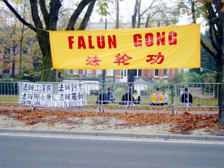 2004年11月12日,部分比利时学员在中国使馆前,要求法办迫害法轮功学员的元凶,并同步支持正在非洲進行的对原吉林610头子苏荣的起诉。