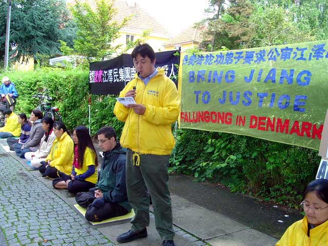 惊闻江氏集团的追随者曾庆红在南非访问期间涉嫌雇凶枪击欲对其起诉的法轮功学员的消息后,丹麦学员于2004年7月3日在中使馆前和平抗议。