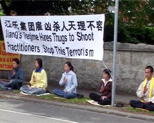 惊闻江氏集团的追随者曾庆红在南非访问期间涉嫌雇凶枪击欲对其起诉的法轮功学员的消息后,爱尔兰法轮功学员于2004年6月29日和30日,在中使馆前和平抗议。