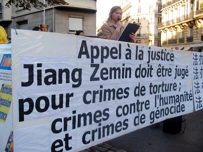 2004年10月29日,法国学员在巴黎的中国驻法国大使馆前和平请愿,要求停止对法轮功的迫害,并公审江泽民、罗干、刘京、周永康。