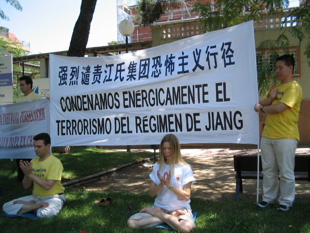 惊闻江氏集团的追随者曾庆红在南非访问期间涉嫌雇凶枪击欲对其起诉的法轮功学员的消息后,西班牙法轮功学员于2004年7月4日,在中国驻西班牙大使馆前和平抗议
