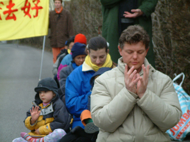 波兰快讯报2003年1月14日报导:年轻的波兰人昨日在中使馆前团结一致,双盘结印、双眼微闭,为遭受中国江氏政权迫害的古老修炼法轮功学员和平请愿,