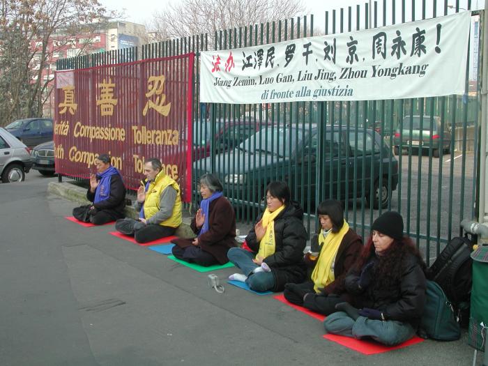 2004年2月15日,部份意大利学员来到米兰中领馆前要求法办迫害元凶江泽民和其帮凶罗干、刘京、周永康。