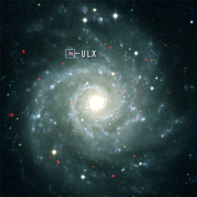 ![]() M74螺旋星系的X射线(红色)和可见光(白色)复合像,小方框内是超亮X射线源,它放射的X射线是中子星和恒星质量黑洞所发X射线的10到1000倍,提供了新一类黑洞存在的证据。 |