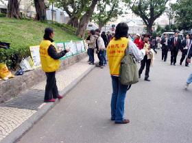 目前,澳门法轮功学员们以手举真象资料的形式继续在旅游景点讲真象,同时,还将进一步和警方联系,讲清真象,也真诚希望澳门警方能抵制来自中共的压力,以善心、良知公正的对待法轮功及法轮功学员。