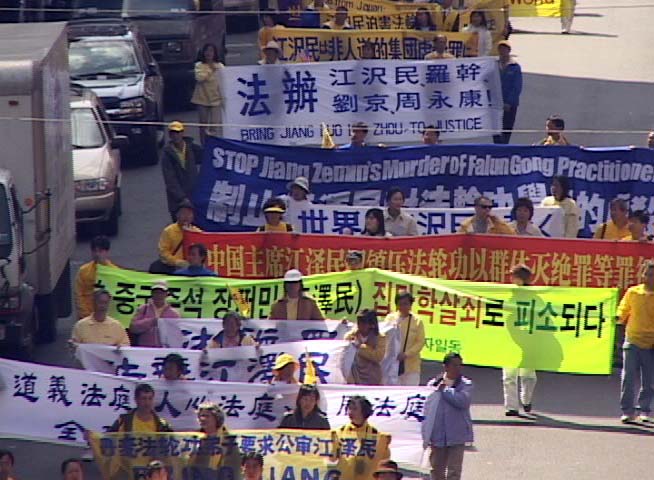 【旁白】中国大陆是世界上唯一镇压法轮功的国家,就是在香港,法轮功都是合法的社团组织。法轮功人在世界各地发动了一系列的游行、静坐等抗议行动,参加各种集会跟当地政府和个人介绍法轮功被迫害的事实,介绍中共对法轮功的不实宣传,他们在各大城市的街头巷尾举办酷刑展、街头剧,用真人秀的方式展示他们所遭受的痛苦,用法轮功人自己的话来说,这不叫搞政治,叫讲清真象。他们利用一切机会介绍法轮功,讲清法轮功到底是什么、不是什么,他好好在什么地方,为什么这么多人炼功等等等等。同时,他们还把镇压法轮功的始作俑者江泽民告上法庭,罪名是群体灭绝。