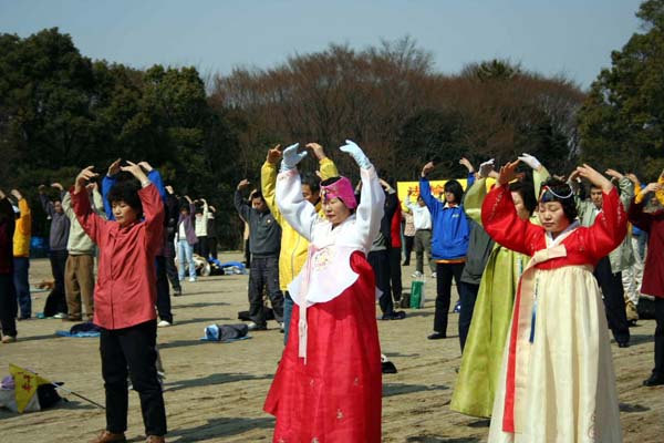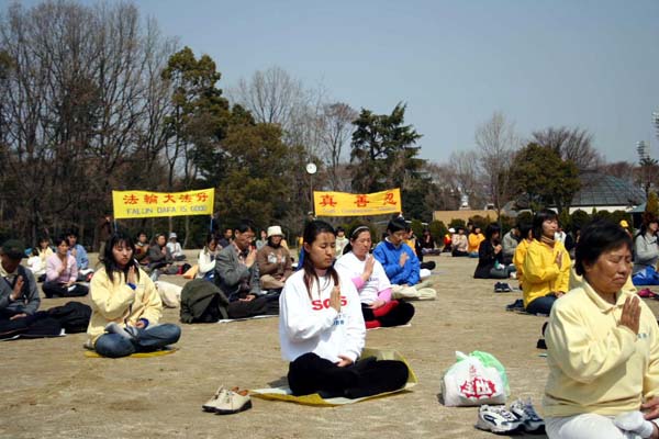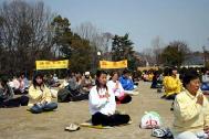 学员在洪法炼功,背景的日本年轻人在演奏摇滚乐,学员闹中取静。(3月25日)