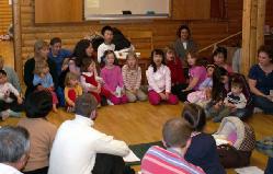 25日晚饭后,这群孩子给大人们带来了一个惊喜。他们为这些大人们唱歌和背诵诗句。他们自己选唱了“法轮大法好”和“为你而来”等歌曲后,用中文和瑞典文朗读了《洪吟》中的几首诗词。他们的童真和认真态度,赢得了所有大法弟子们的热烈掌声。