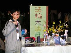 2005年2月25日晚,位于台湾花莲的东华大学,由学生会主办了全校的夜市跳蚤市场活动,该校修炼法轮功的青年学子们也以法轮大法社的名义参加了活动,并在全场最显眼的舞台正前方设置了洪法摊位。