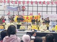 经过几条大街后,各队伍齐聚主舞台前参加民艺华会开幕式。七时三十分,各文、武阵头登台拼艺竞技,再现第二波高潮,鸣锣响鼓将持续至半夜才落幕。腰鼓队在“法轮大法好”音乐的伴奏下,迈着整齐的步伐,舞动着鼓槌,鼓钹声声,传递“真善忍”的福音。