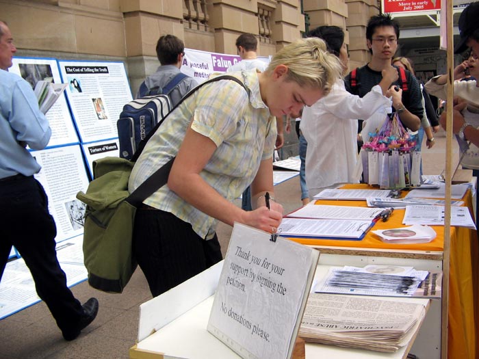 有一位老年妇女一边仔细的阅读真象图片的文字说明,一边擦着眼泪喃喃的说;“为什么?为什么?这还有天理吗?”学员给她解答了她的“为什么”之后,她明白了真象。签了名后,她还想要张签名表回去让她的家人和朋友签。她说:“我相信,我把你们被迫害的情况告诉他们后,他们也一定像我一样毫不犹豫的签名的。”