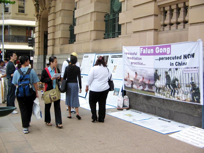 两位模拟酷刑的学员前经常吸引了不少过往的行人驻足观看。更有些人认真的靠前去看扮演钉竹签酷刑者被竹签插得血淋淋的手,并被这种场面和图片上的说明以及一个个发生在中国的法轮功学员被迫害的真象震惊得目瞪口呆。人们表示真想不到在21世纪的今天,仍然有这等残暴的事在中国发生,并纷纷签名表示支持法轮功学员的反迫害和对施暴者的控诉。