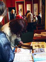 来参观画展的人们正兴致勃勃的学做纸莲花