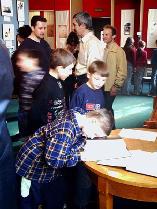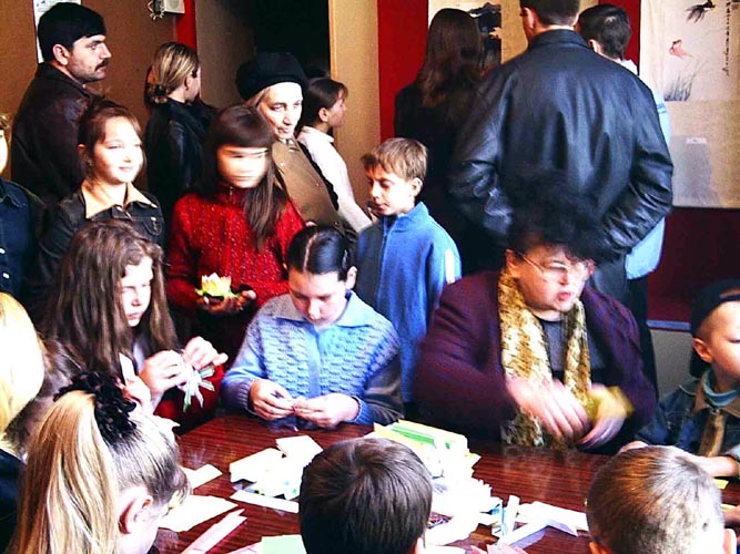 而很多随大人来参观画展的孩子们,对法轮功学员们举办的和平的花瓣活动深深吸引,很多小孩动手做了许多的纸莲花。