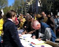 在等候签名的队伍中,有来自不同种族的人,也有中国人。有几位中国人路过这里时看到酷刑演示和图片,不由停住脚步观看,一位学员上前递给他们真象资料说:“法轮功遭迫害是千古奇冤,全世界都知道,你们知道吗?”他们说:“听说过。”学员说:“现在这个迫害还在继续,已经有很多人被迫害致死致残,从八个月的婴孩到七、八十岁的老人都不放过,……”其中一位中国人忍不住了,愤愤的说:“共产党一贯就是那一套,把好人往死里整。”另一个说:“可不是,坏透了!要不中国人怎么都想往国外跑呢。”
