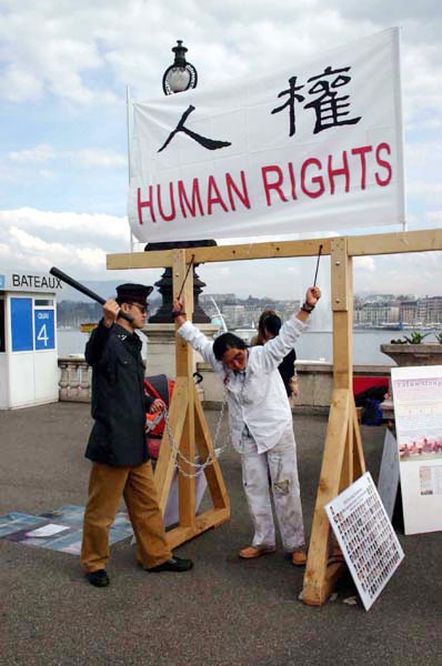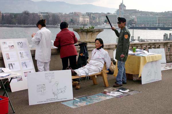 行人停下脚步,露出震惊的神色。旁边的展板回答了他们的问题:这两个人在演示法轮功学员在中国监狱和劳教所中受到的酷刑。这只是很多种酷刑中较轻的一种。在二零零五年三月十四日开始的,为期六个星期的瑞士日内瓦联合国人权大会期间,这样的场景每个周末都出现在日内瓦市中心和日内瓦湖边,在人权大会开始时,参加人权会议的人们还在联合国大楼前的万国广场上看到了法轮功学员的演示。