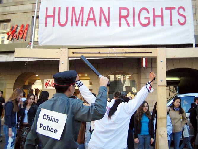 扮演警察的林碰到的是另外的“困难”,时常有路人对他说:“你不能这样对她!这太残忍了!”更有人径直冲到他的跟前,夺下他手中的棍子。虽然会被人骂,但林很欣慰,因为他看到他们的演示触动了人们的善心。他这个假警察还和真警察有过一次“较量”呢。一次一个瑞士警察不让他们展示揭露酷刑的图片,说是太血腥,太可怕。林对他说,这些图片是为了让人们看到发生在中国的事实真象,呼吁人们帮助无辜受难的人们,很多人就是看了这些图片,才知道迫害有这么严重,他们才在呼吁停止迫害的信上签了名。真警察认真的听了林的话,说:“你把我说服了,你们接着做吧。”