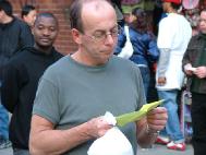 一个西方男士很卖力的帮着布置会场,后来一直坐在学员之中,学员发现去年的纪念活动他也坐在学员的队伍里。他说:“我很喜欢和法轮功学员在一起。”