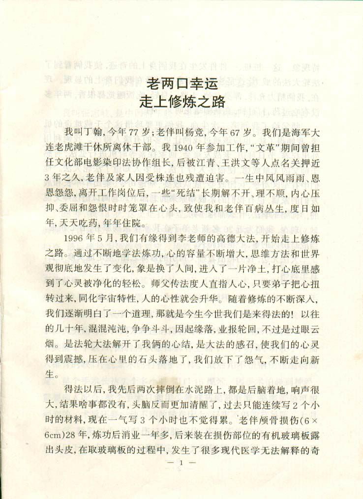 我叫丁翰,今年77岁;老伴叫杨竞,今年67岁。我们是海军大连老虎滩干休所离休干部。我1940年参加工作,“文革”期间曾担任文化部电影染印法协作组长,后被江青、王洪文等人点名关押近3年之久,老伴和家人因受株连也惨遭迫害。一生中风风雨雨、恩恩怨怨,离开工作岗位后,一些“死结”长期解不开、理不顺,内心压抑、委屈和怨恨时时笼罩在心头,致使我和老伴百病丛生,度日如年,天天吃药,年年住院。