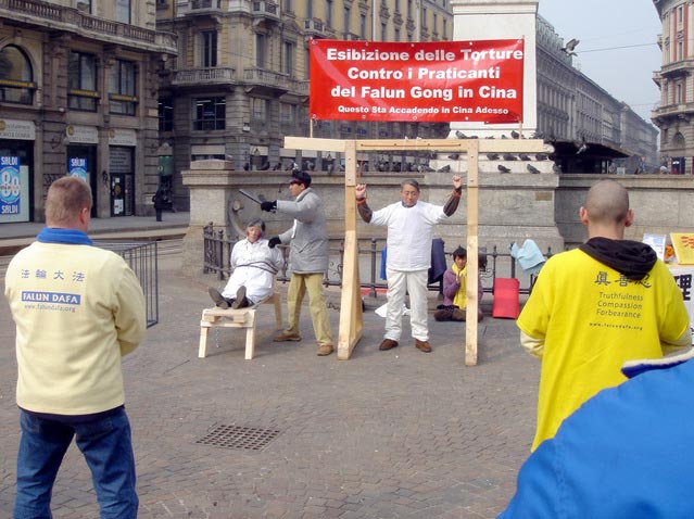 展台上挂着中、意文的“法轮大法好”横幅,“法办江泽民、罗干、刘京、周永康”的条幅更是醒目。在地面上摆放着揭露江氏集团迫害法轮功学员的多种酷刑的图片和文字说明。学员们模拟了吊刑和上老虎凳两种酷刑还有被警察用电棍电击的情景。