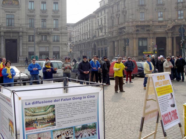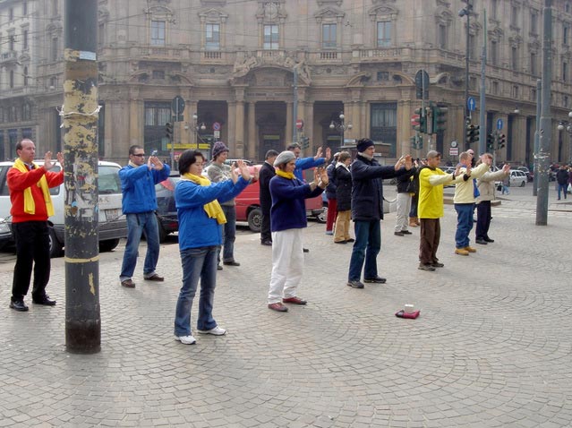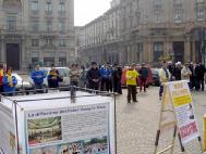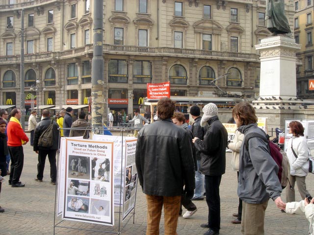 尽管天气非常寒冷,学员们仍然照常炼功、发正念并向众多的过往行人发放传单和讲清真象。这一天是星期天,广场上过往的行人络绎不绝,人们看到酷刑展时,对江氏集团如此残暴的对待这些手无寸铁的修炼群众感到震惊和不理解。人们纷纷主动在征签表上郑重的签下他们的名字,表示他们对学员的支持和同情及他们要求制止迫害的愿望。行人大多是意大利民众,也有不少外国游客。有两位来自希腊的旅游者主动索要希腊文的真象资料。