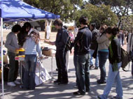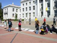 这两天,在伯克利大学校园里的学生会广场的一侧,北加州湾区的部分法轮功学员,有的身穿血迹斑斑的白衬衫,在伯克利校园里扮演在中国国内遭受酷刑折磨的同修,还有几位学员身穿绿色警服,装扮成中国警察(在中国大陆也称公安),恶狠狠的手持棍棒站在一旁;另一侧,部分学员在悠扬的炼功音乐下,演示着祥和的法轮功五套功法;形成了鲜明的对比。这也成为校园里的一“独特”风景。