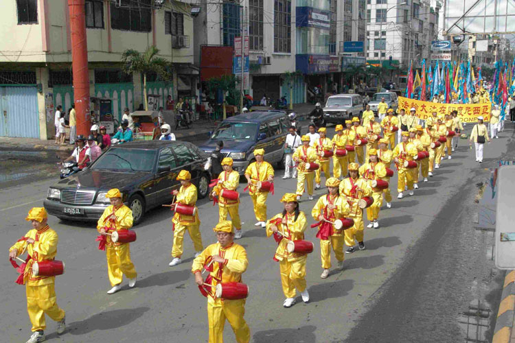 游行由大型“法轮大法”标志领先,腰鼓队开路,鼓声阵阵,气势磅礴,正气凛然,学员冒雨行进,个个神采奕奕。仙女队手捧着莲花、莲花中间是一本《转法轮》模型,有挂着彩灯的花车,学员在平板车上演示炼功动作,还有中国法轮功学员被中共残酷迫害的真人酷刑展。队伍沿着华人聚集的东方金色云彩街行进,警车开路护送,对街坐在车辆里的人们看到中华传统服装首次出现在棉兰市,感到好奇和惊叹。有棉兰市民称这是“有史以来的最壮观景象”。
