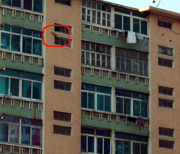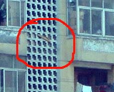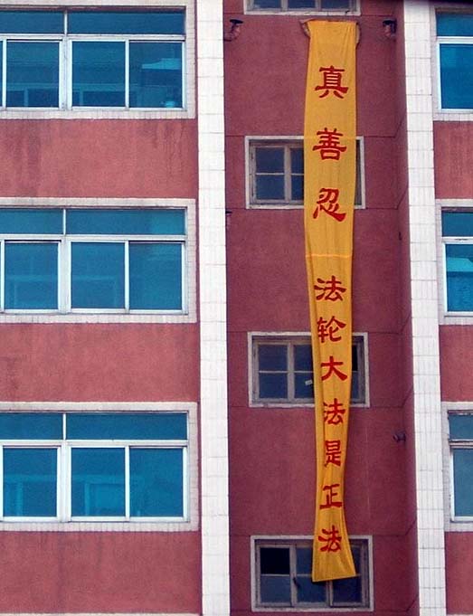 【明慧网2005年4月23日】将制作好的条幅用牛皮纸包好(因牛皮纸和许多楼房的颜色相近,不易被发现):包之前要将条幅下面配好重在卷起,快卷到上边留约半尺,垫上牛皮纸继续卷到上端,用线绳先系好。另用二根一尺左右的尼龙线将二根线头集中到一起(不打结)固定在盛水的小器皿中(或冰箱用的制冰块小盒)冻成冰砣,另外二根线头散开。到达选好的挂条幅的地点后,将条幅事先系好的线绳取下,把冻成冰砣的尼龙绳散开一段系在条幅上挂好,如想让其加速融化,可将包好细盐的方便袋底部扎些小孔覆在冰砣上,这样便完成了挂放条幅。待冰砣融化,线头散开,条幅自动展开。此法春、夏、秋、冬(只要不是太冷)都可作。夏天可将冰砣用一泡沫制成的保温盒携带(夏天冰砣稍大些)。